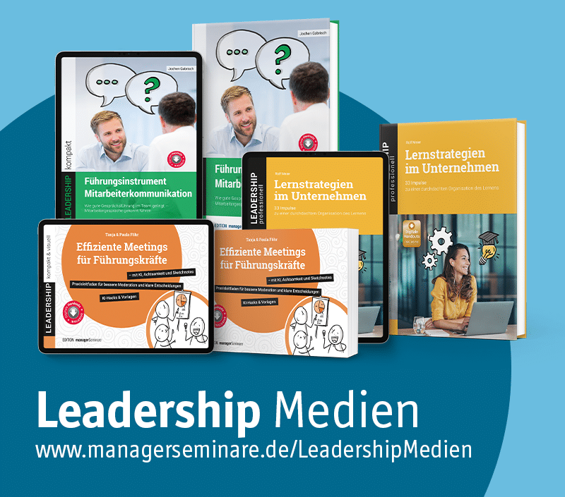 Die Leadership-Buchreihen von managerSeminare liefern kompaktes, sofort anwendbares Know-how für moderne Führung – von der Selbstführung über Mitarbeiterkommunikation bis zur Unternehmensentwicklung. Das Programm vereint Neuerscheinungen und Neuauflagen zu hochrelevanten Themen wie ethische Entscheidungsfindung, Konfliktmanagement in Projekten, resiliente Führung, effiziente Meetings sowie praktisches Systemverständnis im Unternehmen. Alle Titel sind als Buch und in eBook-Formaten (PDF oder ePub) verfügbar, Neuheiten können vorbestellt werden – schnell lieferbar für Ihren Führungsalltag. Mitglieder der Zeitschrift managerSeminare profitieren zudem von Vorzugspreisen.